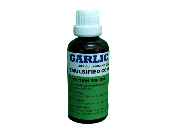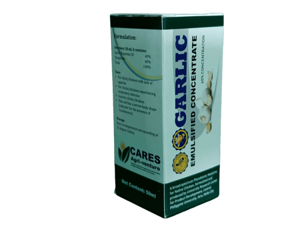 The CPU Garlic Emulsified Concentrate is proven effective against Mycoplasma spp (sipon, halak), Staphylococcus spp (pamamaga ng kasukasu-an, sakit sa balat), Shigella (pananamlay), E coli (mahina lumaki at pagtatae na may dugo), and many others. There is no need to deworm the flock treated with this phytomedicine. Our studies showed that it helps to boost the immune system of the treated animal, enhance the meat quality, and lowers the cholesterol and uric acid level of native chicken products. All you need to do is to put three to five drops of CPU Garlic Emulsified Concentrate in a kilo of feed. Precaution, offer only during the cooler part of the day. Give three times a week at one-day intervals or if necessary because of a cold environment.